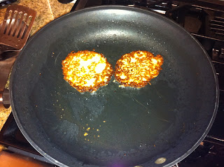 Heat oil in a pan and drop spoonfuls of the potato mixture into oil. Flatten to make extra crispy!